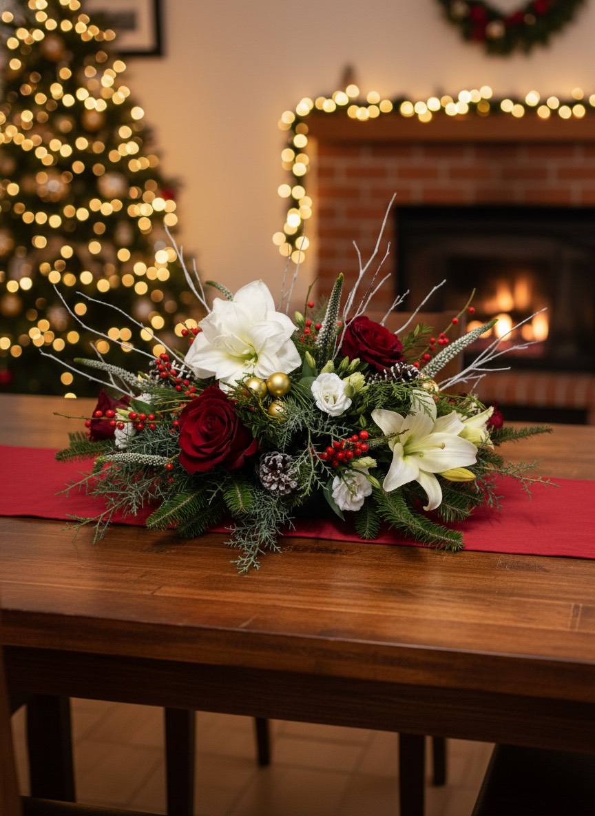 Elongated centerpiece with roses, berries, assorted pines, pine cones, branches, amaryllis, ornaments & ribbon.