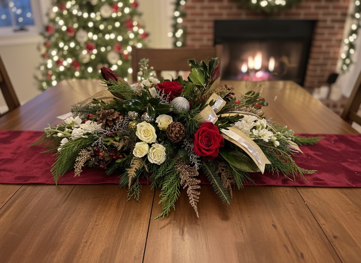 Elongated centerpiece with roses, berries, assorted pines, pine cones, amaryllis magnolia, ornaments & ribbon.