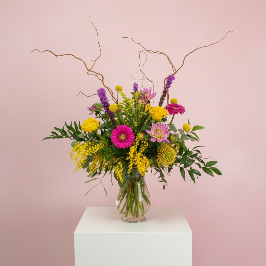 Spring is in the air! Celebrate with this arrangement containing roses, dahlias, liatris, curly willow, craspedia, mimosa, gerbera, solidago, assorted foliage & textures.