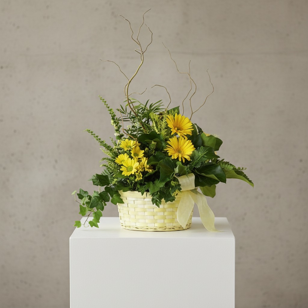 Classic dish garden in a basket with yellow flowers.