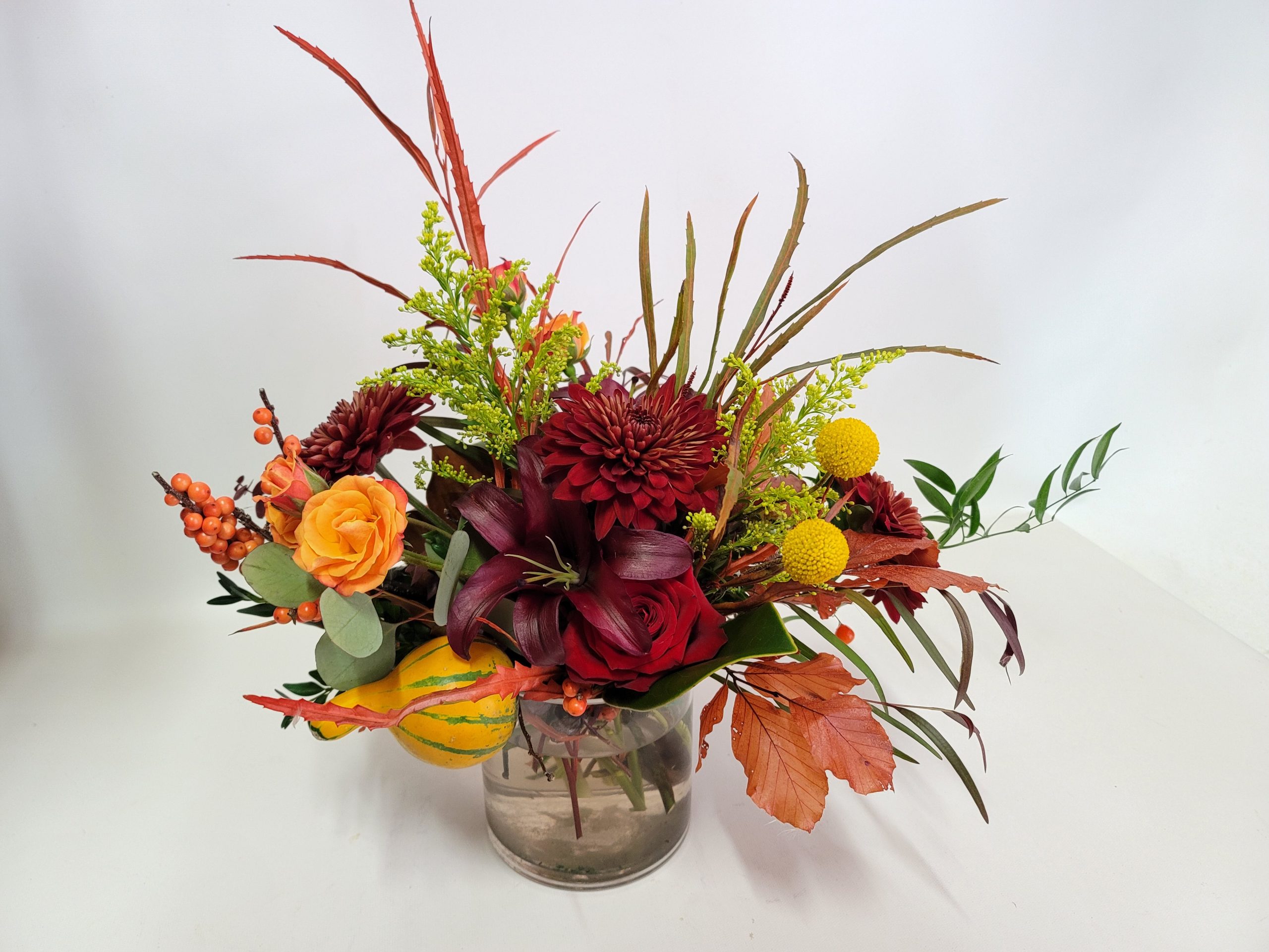 Fresh arrangement with lilies, mums, roses, berries, assorted foliage & textures.