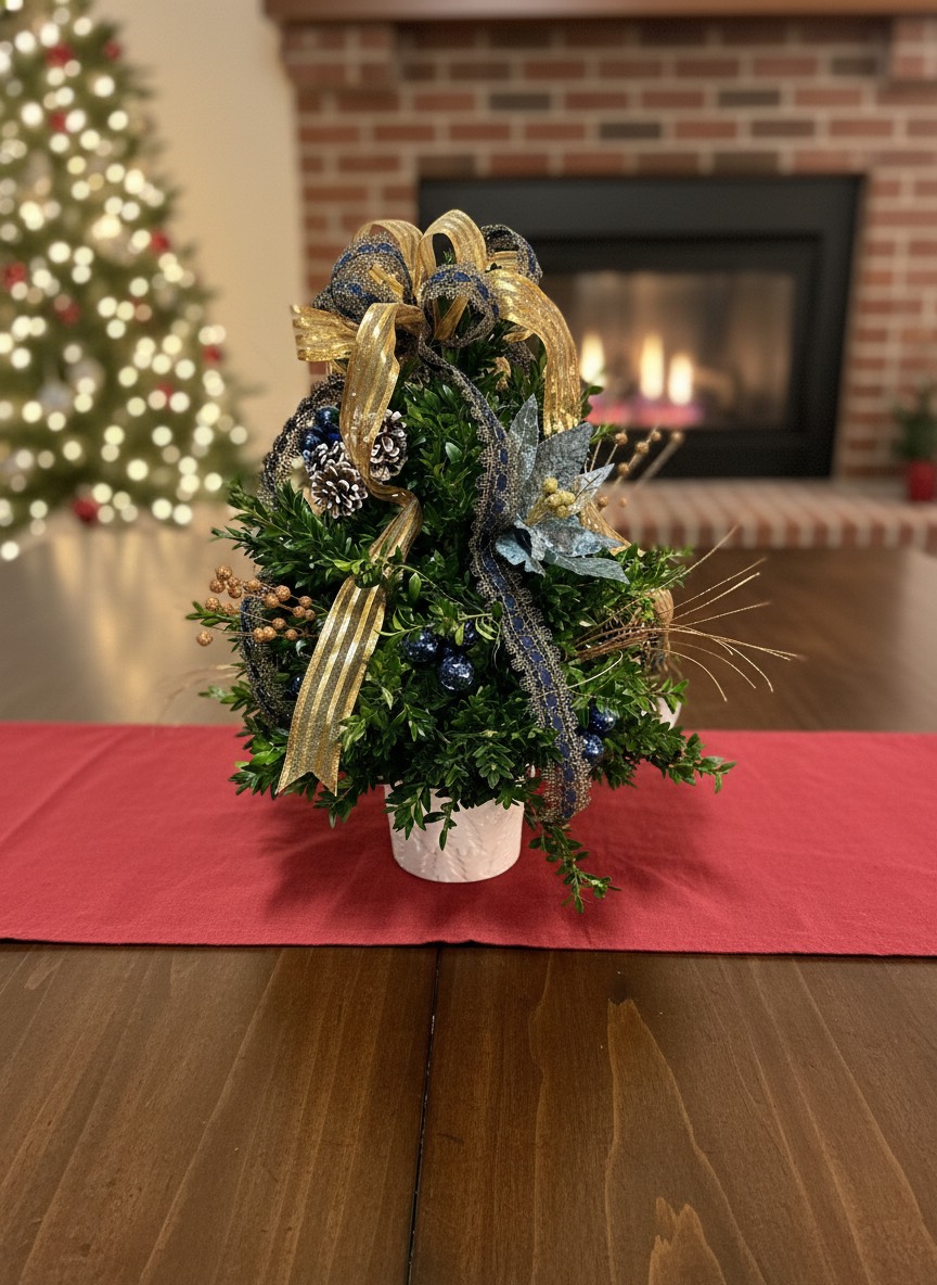 Decorated boxwood tree for the holidays.