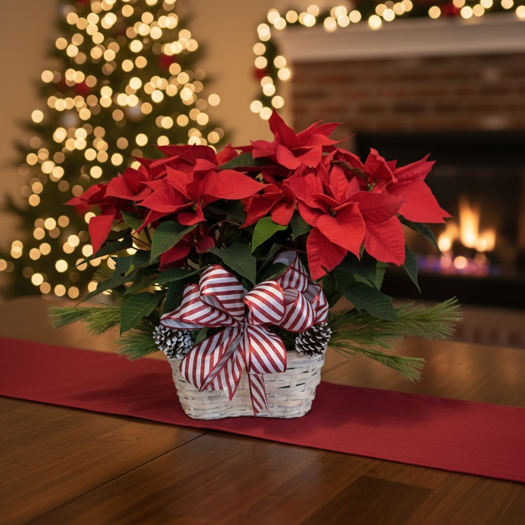 Large Poinsettia plant in a basket with a bow.
