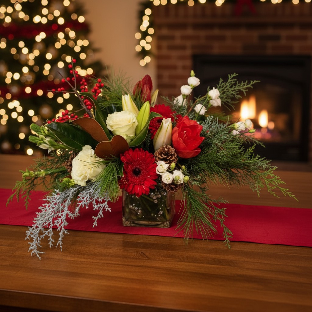 A festive piece for the holidays to include roses, oriental lilies, amaryllis, ilex berries, gerbs, pine cones assorted foliage & textures.