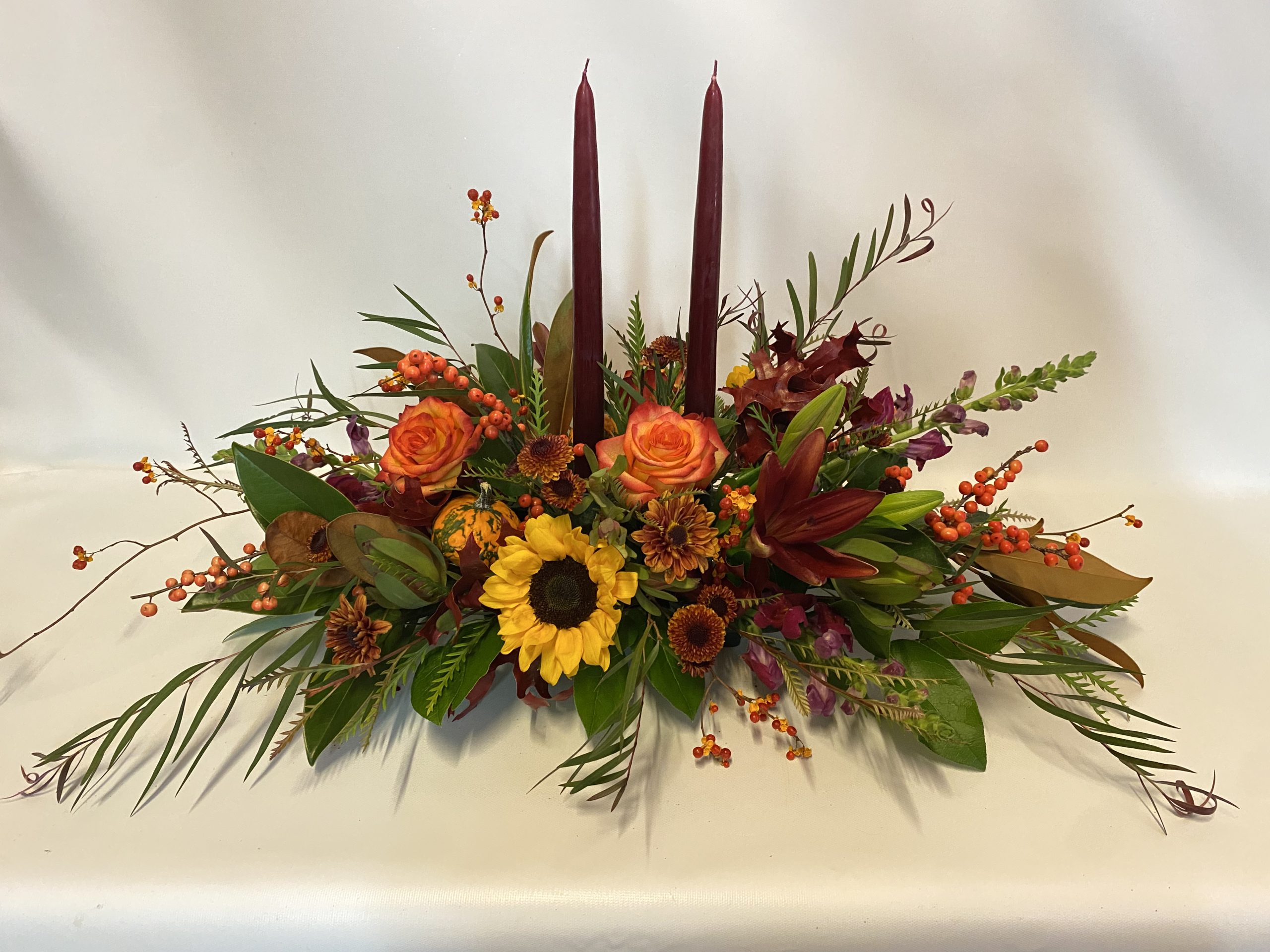 Autumn centerpiece with seasonal flowers, textures.